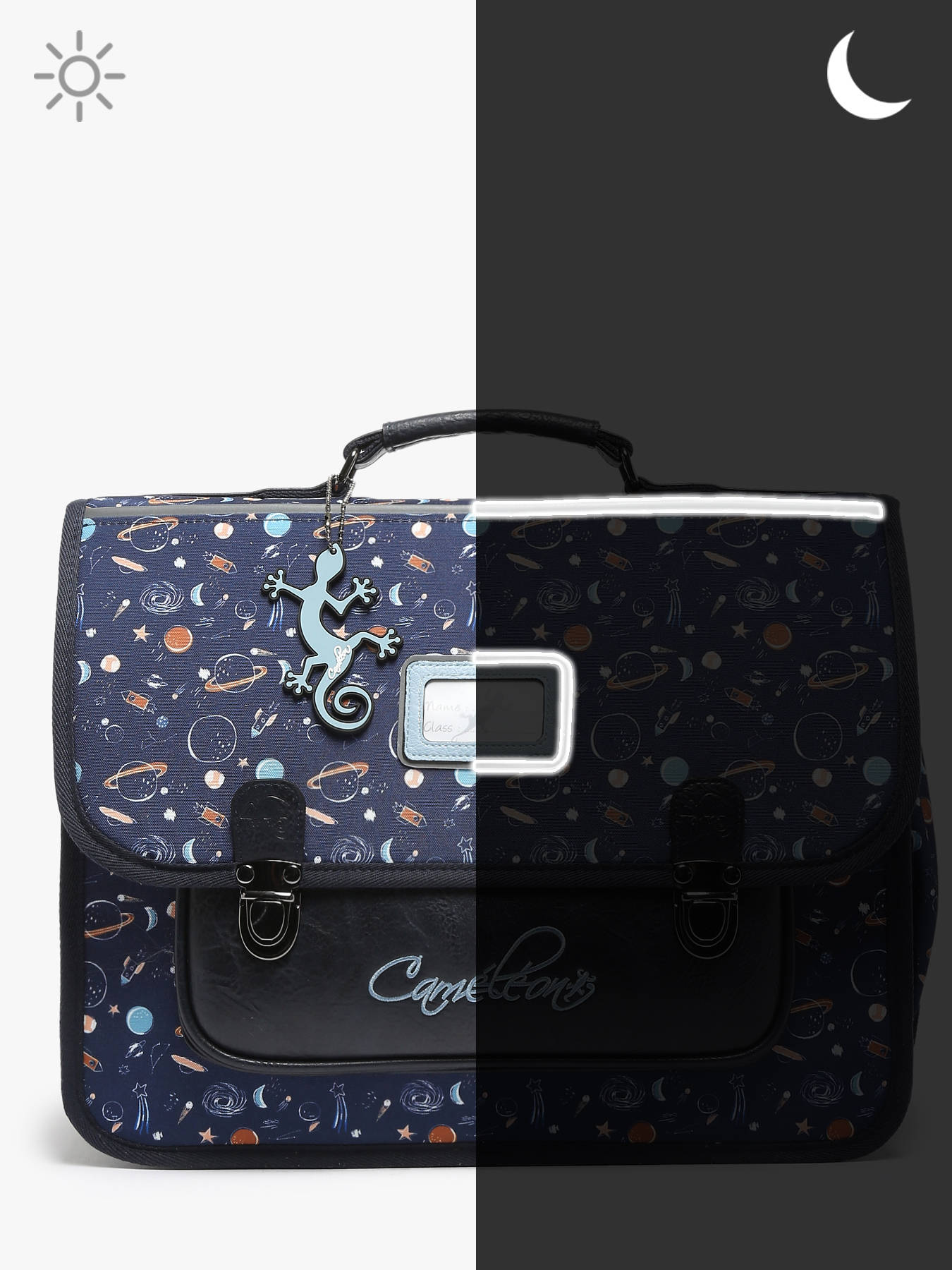 35 cm - 13 liter - 1.1 kg ~ Deze toffe boekentas uit de Retro collectie van Caméléon is ideaal voor de kleuterklas, of die eerste stapjes in het basisonderwijs. Uw kind zal verzot zijn op de kleurrijke print en retro uitstraling! De boekentas kan veilig worden geopend en gesloten dankzij het dubbele kliksysteem, en binnenin zijn twee gescheiden opbergvakken voorzien. Ideaal om een schoolagenda, schriften en een pennenzak in te stoppen! Er is ook een handig steekvakje aan de voorkant voorzien, en een elastisch zijvak waar een waterfles in kan opgeborgen worden. Onder de overslagflap bevindt zich een uniek opbergvakje voor een liniaal. En dankzij enkele reflectoren kan uw kind zich veilig in het verkeer begeven. Tenslotte zijn de verstelbare schouderbandjes en rugzijde gewatteerd, voor een optimaal draagcomfort.