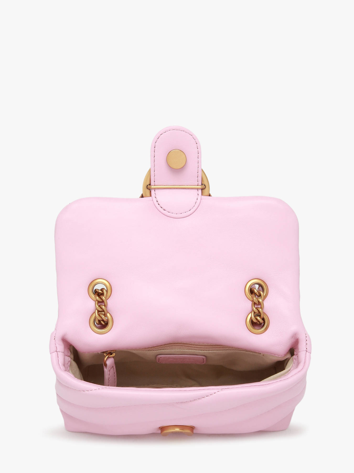 Is deze Love Baby Puff cross body tas van het Italiaanse merk Pinko niet onweerstaanbaar? Dankzij z'n compacte formaat, mooie lederkwaliteit en charmante details bezorgt dit accessoire eender welke outfit een glamoureuze touch. De iconische ""Love Birds"" (of tortelduifjes) vormen de iconische sluiting van deze tas. Binnenin is een compact interieur met een handig rits- en steekvakje voorzien, waar je jouw essentials makkelijk in kan opbergen. De chain schouderriem is verstelbaar, en kan gekruist of lang over de schouder gedragen worden.