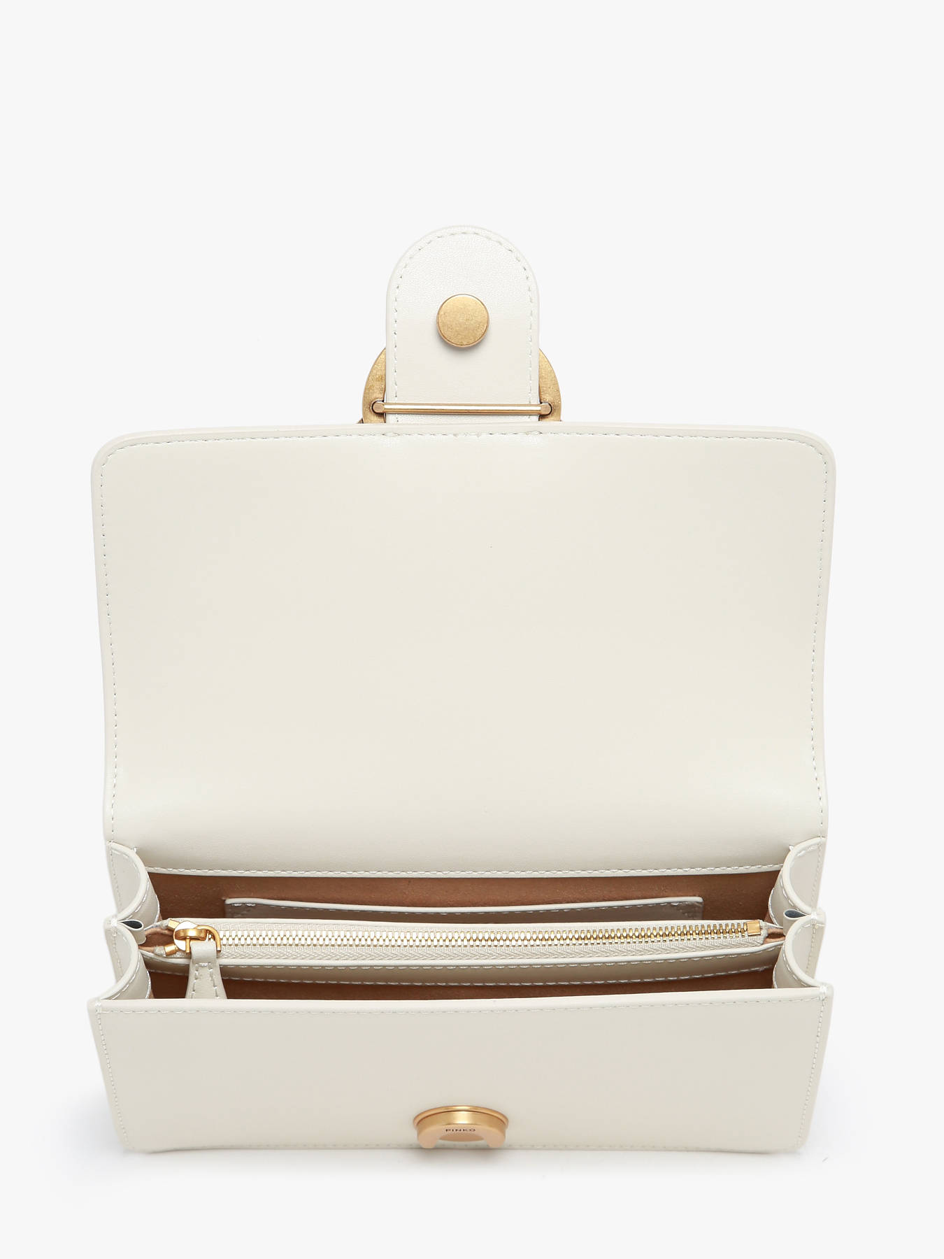 Deze Mini Love One cross body tas van Pinko bezorgt elke outfit een glamoureuze touch! Deze compacte cross body tas is gemaakt van glad rundsleer, en werd afgewerkt met zilverkleurige studs en de iconische ""Love Birds""-sluiting van het merk. Binnenin zijn twee compartimenten voorzien, gescheiden door een plat middenvakje met rits. Zo kunt u uw spulletjes veilig en overzichtelijk opbergen. De chain schouderriem is verstelbaar met gesp, en kan gekruist of lang over de schouder gedragen worden.